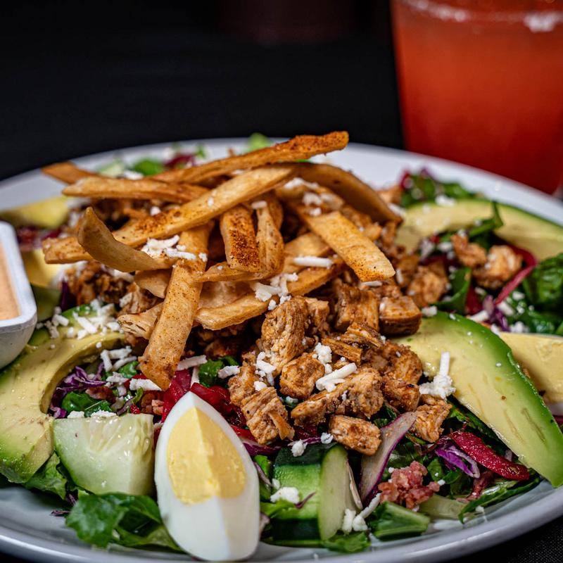 Romaine, grilled chicken breast, red cabbage, bacon, egg. avocado, cucumber, pickled red onion, tortilla crisps, jalapeño ranch.