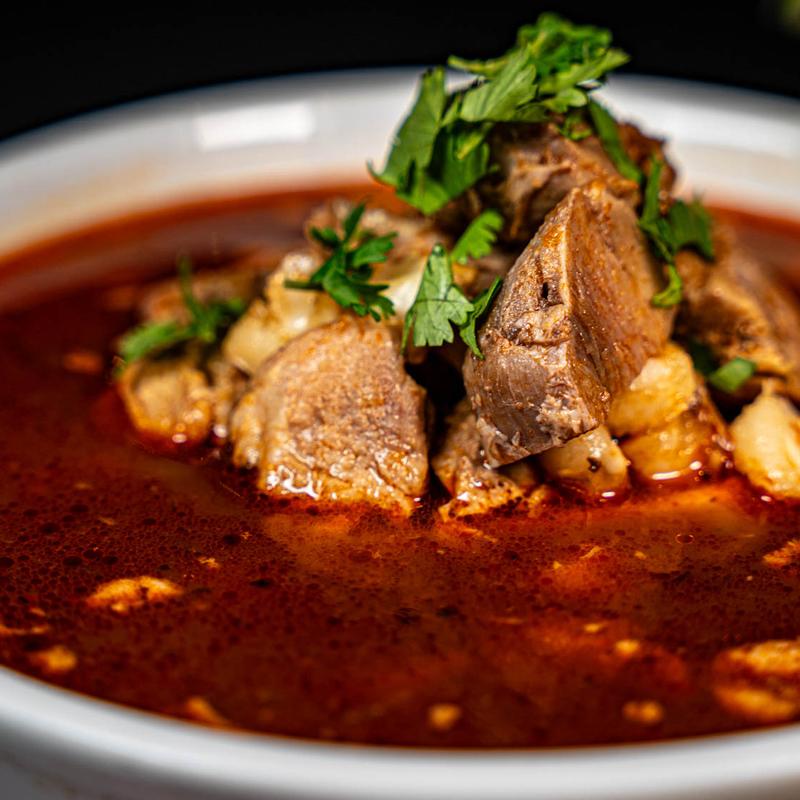Mexico's classic pork and hominy soup in ancho broth, served with cabbage, onion, radish, and tortilla crisps.